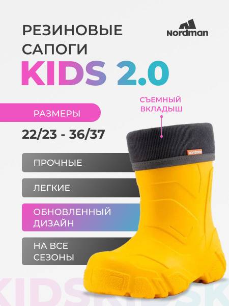 Nordman Kids 2.0 rubber boots offer the perfect blend of style and functionality for children. Crafted using seamless, one-piece construction, these boots are completely waterproof and prevent leaks. Designed for year-round wear, they're suitable as summer footwear (up to +20°C) without the fleece liner or as winter boots (up to -15°C) with the included liner. However, comfortable temperature may vary depending on individual child. The liner's presence doesn't affect the comfort of these EVA rubber boots. Made from super-lightweight, flexible EVA material, these boots provide excellent thermal insulation, keeping little feet warm. The EVA material is also highly elastic and mechanically strong, even in sub-zero temperatures. The durable outsole ensures superior grip on snowy surfaces.