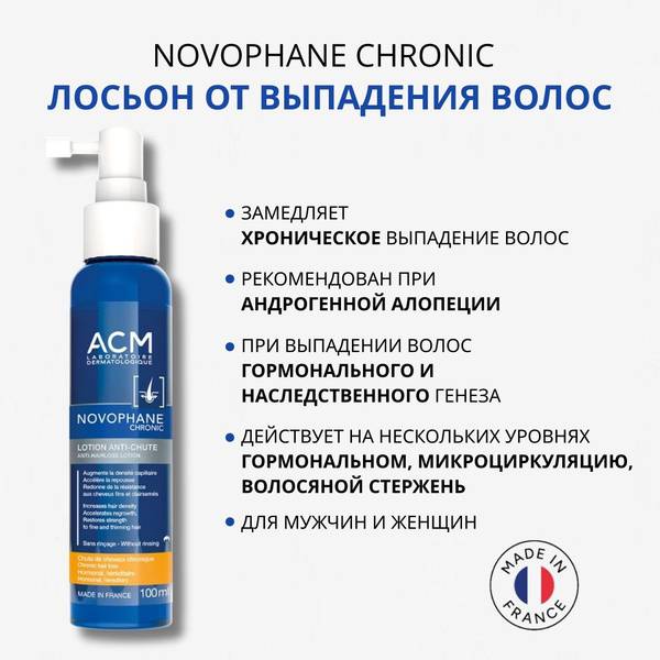 Experience the NOVOPHANE Chronic difference. This innovative hair loss treatment from ACM combats chronic hair loss, whether hormonal or hereditary. Formulated with NovoDensyl, it stimulates hair follicle stem cells, leading to stronger, thicker, and shinier hair. See visible results in as little as 6 weeks! Say goodbye to thinning hair and hello to a revitalized scalp and fuller, healthier locks. Ideal for men and women experiencing hair thinning and hair loss.