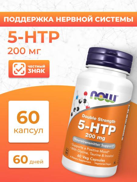 <hr>Experience the benefits of NOW 5-HTP, a high-quality dietary supplement featuring 200mg of pure 5-HTP per capsule, totaling 670mg per serving. Extracted from the seeds of the African plant Griffonia simplicifolia, 5-HTP is an essential precursor to serotonin, a neurotransmitter crucial for regulating mood, sleep patterns, appetite, and body temperature. Support your brain and central nervous system's serotonin production for improved sleep, a balanced mood, and enhanced relaxation. This supplement is ideal for those seeking natural mood enhancement and sleep support. It is a dietary supplement, not a medicinal product. Contraindications: Individuals with known hypersensitivity to product components, pregnant or breastfeeding women, and those taking monoamine oxidase (MAO) inhibitors or antidepressants should not use this product. A doctor's consultation is recommended before use. Storage: Keep in a dry place, out of reach of children, at a temperature not exceeding +25°C. Shelf life is 2 years. Discover our extensive product line, including Gamma-Aminobutyric Acid (GABA), Vitamin D3, 5-Hydroxytryptophan, Vitamin B complexes, Co-Enzyme B-Complex, Inositol, Pantothenic Acid, Vitamin C, Chromium Picolinate, Iron, Selenium, Zinc Picolinate, Zinc Glycinate, Omega 3 Fish Oil, Organic Iodine, Melatonin for sleep, Multivitamins for Men and Women, Joint & Ligament Support, and products for skin radiance.