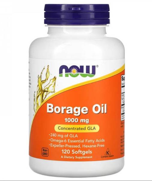 Borage oil, NOW Foods, Gamma-Linolenic Acid (GLA), Omega-6 fatty acids, essential fatty acids, cold-pressed, hexane-free, non-GMO, kosher, dietary supplement, health supplement, skin health, women's health.