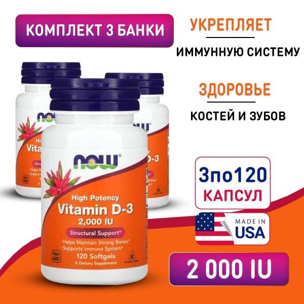NOW Vitamin D3 2000 IU: 3 Bottles of 120 Softgels for Immune Support, Strong Bones & Teeth