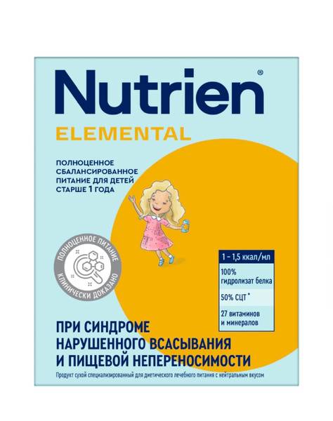 Nutrien Elemental is a hypoallergenic, extensively hydrolyzed protein formula designed to meet the unique nutritional needs of children over 1 year old diagnosed with malabsorption syndrome and various food intolerances. This specialized medical food provides a complete and balanced nutritional profile, ensuring adequate intake of essential nutrients, energy, vitamins, and key macro and micronutrients.