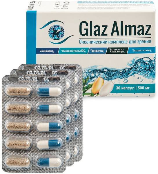 Glaz Almaz, eye capsules, vision improvement, lutein, omega-3, elastin, eye health, cataracts, glaucoma, macular degeneration, retinal health, corneal health, immune support, cardiovascular health, natural eye supplements, Sacher-Med, goji berry, olive leaf extract, cordyceps, propolis, antioxidant, anti-inflammatory, vision restoration, eye drops, improved blood circulation, micellar technology, native extracts.