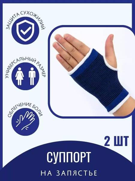 This elastic textile wrist support brace prevents sprains and bruises during strenuous physical activity. It reduces excessive strain on joints and ligaments. The set includes two braces. Care instructions: Do not bleach, iron, or machine dry. Hand wash only. Color: Blue.
