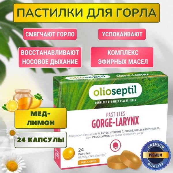 Keywords: Olioseptil, Gorge-Larynx, throat lozenges, honey lemon, sore throat, laryngitis, cold relief, flu relief, essential oils, pain relief, throat pain, cough suppressant, natural remedy, fast relief, family remedy, convenient, on-the-go relief.
