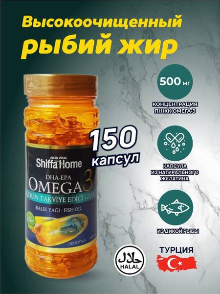Shiffa Home Premium Omega-3 Fish Oil provides 150 capsules of 100% pure, high-quality fish oil in vegetarian capsules. Halal certified. Each 4 capsules delivers 2000mg of fish oil, containing 700mg Omega-3, 360mg EPA, and 240mg DHA. Support your cardiovascular health, reduce cholesterol, decrease blood clot formation, and help prevent arrhythmia. Omega-3 fatty acids contribute to reduced diabetes risk. Omega-3s are also traditionally used to support the treatment of conditions such as tuberculosis, anemia, and night blindness. Experience improved cognitive function and enhanced skin, hair, and nail health thanks to the vitamins A and D naturally present in fish oil. Recommended dosage: 2 capsules, twice daily, with meals.