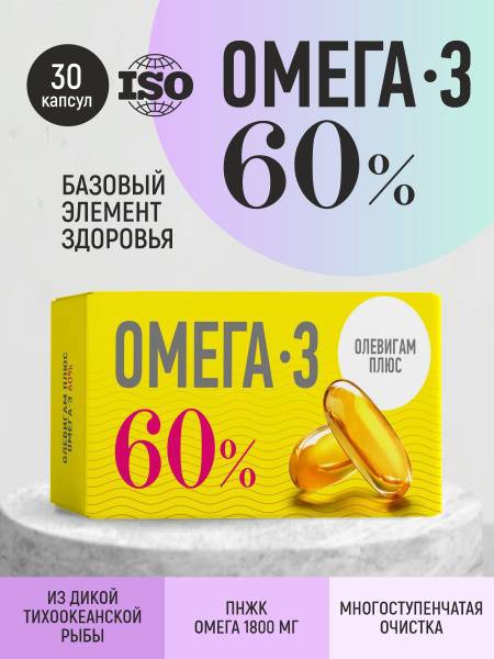 OleviGam Plus Omega-3 60% provides a high concentration of essential fatty acids crucial for overall health. Your body doesn't produce Omega-3s; they must be obtained through diet. These vital nutrients support cellular health, combatting premature aging and regulating lipid metabolism. The 60% concentration helps cleanse blood vessels, reducing cholesterol buildup and preventing plaque formation. OleviGam Plus contains EPA (eicosapentaenoic acid) and DHA (docosahexaenoic acid), which normalize blood viscosity, increase "good" HDL cholesterol, and lower homocysteine levels—a crucial factor in reducing the risk of blood clots. Each capsule delivers 600mg of Omega-3s, including 330mg EPA and 220mg DHA, supporting heart, vascular, immune, and skin health. 30 capsules per pack.