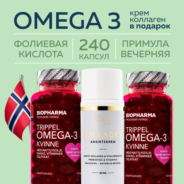 Biopharma Trippel Omega-3 Kvinne provides a potent blend of Norwegian triple-strength Omega-3 fatty acids, crucial for women's health and well-being. This premium supplement delivers high concentrations of Omega-3s (DHA and EPA), vital for brain function and cardiovascular health. It also features essential vitamins D3, K2, and E, along with folic acid, beneficial for reproductive health and especially important during pregnancy. Evening primrose oil helps alleviate PMS symptoms and promotes healthy hair and nail growth. The addition of cocoa provides a delicious flavor, boosts energy, and elevates mood.