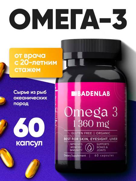 Keywords: Omega-3, Omega 3, fish oil capsules, heart health, brain health, cognitive function, memory, concentration, skin health, hair health, nail health, immunity, inflammation, cholesterol, triglycerides, atherosclerosis, depression, anxiety, mood, joint health, men's health, women's health, Badenlab, 60 capsules, 1360mg, bioavailable Omega-3, supplements, vitamins, healthy aging, 50+, 60+, multivitamins.