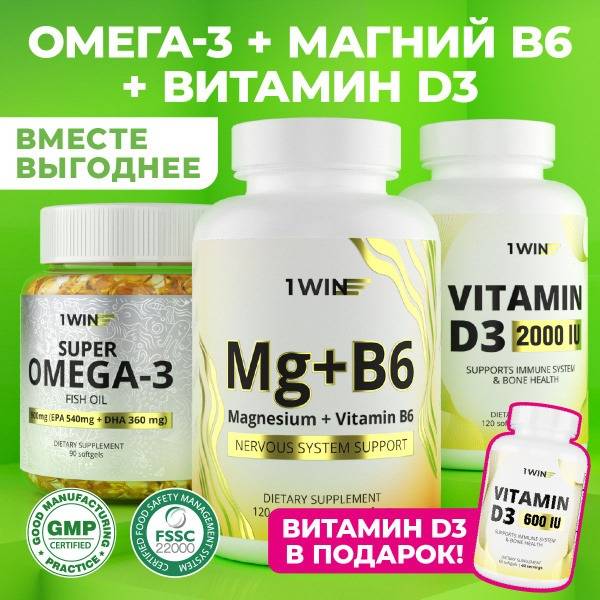 This 1WIN essential nutrient pack boosts well-being, energy levels, and skin health. Includes Omega-3, Magnesium + B6, and Vitamin D3 2000 IU (with a bonus 600 IU Vitamin D3 for preventative use). Omega-3 fatty acids support brain function, nerve health, and overall bodily processes, benefiting skin, hair, and nails. (90 capsules). Magnesium + B6 provides stress relief, supports nervous system function, and enhances cognitive function and physical activity. (120 capsules). Vitamin D3 2000 IU strengthens immunity, supports bone and joint health, and improves mood. A 600 IU dose is ideal for preventative maintenance. Follow package instructions. The perfect gift for birthdays, holidays, anniversaries – for her, him, family, friends, and more.