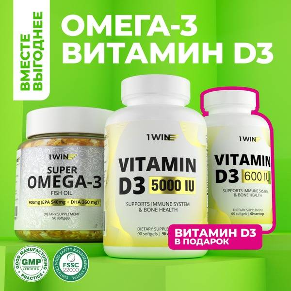 Boost your immunity with this powerful Omega-3 and Vitamin D3 supplement pack from 1WIN. This innovative combination features high-potency Vitamin D3 (5000 IU) for rapid deficiency correction and a bonus Vitamin D3 (600 IU) for daily maintenance. Omega-3 fatty acids (EPA & DHA) reduce inflammation, support cardiovascular health, and improve brain function, skin, hair, and nails. Vitamin D3 strengthens the immune system, supports bone health, and contributes to healthy endocrine, nervous, and cardiovascular systems. Both are easily absorbed and are certified to ISO and GMP standards. Includes a bonus Vitamin D3 600 IU. Store in a cool, dry place away from direct sunlight and out of reach of children (5-25°C, <70% humidity).