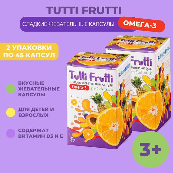 Discover the delicious and effective Tutti Frutti Omega-3 gummy capsules, a premium supplement for children and adults. Each sweet, chewable tutti frutti capsule is packed with high-quality tuna fish oil, an exceptional source of Omega-3 fatty acids, particularly docosahexaenoic acid (DHA).