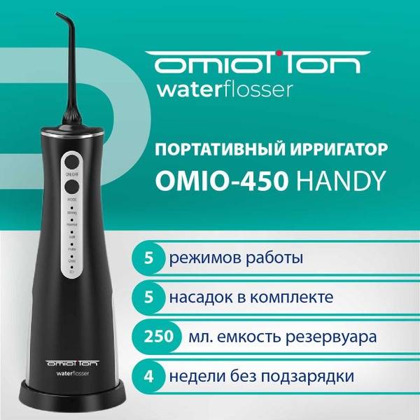 The OMIO-450 BLACK portable oral irrigator is the perfect choice for health-conscious individuals who value convenience and portability. Its sleek design features pulsation and battery life indicators. Take superior oral care on the go – ideal for business trips and vacations. This powerful irrigator boasts up to 1000 kPa pressure with 5 modes (4 adult, 1 child at 200 kPa). Enjoy a larger-than-average 250ml water reservoir, ensuring fewer refills. Ergonomic design prevents water leakage, while its IPX7 waterproof rating guarantees safety. The long-lasting battery provides over 20 days of use on a single charge. Includes 5 nozzles: 2 standard, orthodontic, orthopedic, and a tongue cleaner. A hard case keeps nozzles organized, and a protective soft travel case safeguards your irrigator. Compact enough for any bag. Maintain optimal oral hygiene wherever you go with the OMIO-450 BLACK.