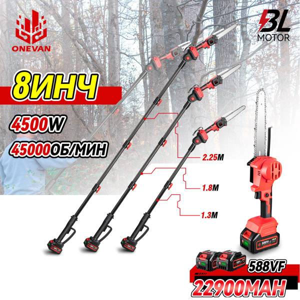 Power through high branches with ease using the ONEVAN 8-inch cordless chainsaw. This powerful tool boasts a 4500W motor and an impressive 45000 RPM no-load speed, ensuring efficient cutting. The 2.5cm (0.98-inch) pitch chain delivers smooth, precise cuts. At 7.4 feet (2.25m) in length, it offers excellent reach. The package includes two 588VF, 229000mAh batteries and a dedicated charger, providing ample power for extended use. Compatible with 18V batteries (please note voltage compatibility).