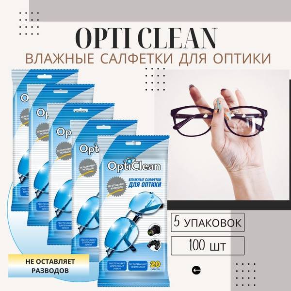 OptiClean lens cleaning wipes offer the perfect solution for gentle yet effective cleaning of your eyeglasses, optics, and screens. Each pack contains 20 individually wrapped wipes, providing a convenient and hygienic way to maintain pristine clarity. This 5-pack bundle ensures you're always prepared. These soft wipes effortlessly remove dirt, dust, fingerprints, and smudges from all types of lenses, including eyeglasses, sunglasses, and reading glasses. Their gentle formula is safe for all optical surfaces, leaving no streaks or residue. Compact and portable, OptiClean wipes are ideal for on-the-go cleaning, easily fitting into purses, pockets, or travel bags. Experience the convenience of quick, effective cleaning every day, ensuring crystal-clear vision and extending the life of your valuable eyewear. Choose OptiClean for superior lens care and daily convenience.