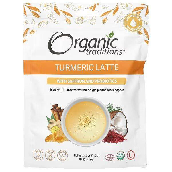 Indulge in the rich, creamy flavor of Organic Traditions Turmeric Saffron Probiotic Latte. This convenient, instant blend combines the powerful antioxidants of turmeric and ginger with the calming properties of saffron and the gut-supporting benefits of probiotics. Simply add water for a comforting, caffeine-free beverage that's perfect any time of day.