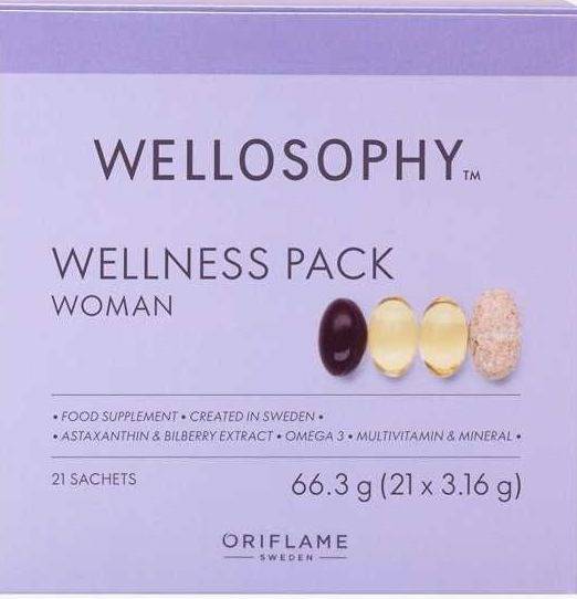 "description": "Support your daily well-being with Oriflame's Wellness Pack for Women. Each pack contains a multivitamin & mineral tablet, two Omega-3 capsules, and one Astaxanthin & Bilberry extract capsule – a convenient blend of essential nutrients in 21 single-serve sachets (66.3g total). Not a medicine.",