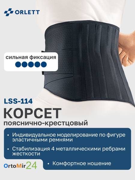 The Orlett LSS-114 2G lumbar support corset provides strong support for the lumbar-sacral spine. Its four adjustable metal stays effectively stabilize the lower back, reducing pain and allowing for comfortable movement even during acute pain episodes. This back brace significantly reduces the need for pain medication. The breathable 3D Mesh fabric ensures all-day comfort, while the adjustable design and additional elastic straps provide a customized fit. Durable Micro Velcro closures offer a secure hold without damaging clothing. Available in short (under 165cm) and standard (over 165cm) sizes. Ideal for: acute and chronic lower back pain (radiculitis, spinal stenosis, spondyloarthrosis, spondylitis, herniated or protruded discs, spondylolisthesis, sacroiliitis); post-operative or post-injury rehabilitation of the pelvic ring or lumbar spine; and as part of a comprehensive treatment plan including manual therapy, massage, medication, and physiotherapy. To ensure the correct fit, measure your waist and hip circumference snugly (but not tightly) using a tape measure before ordering.