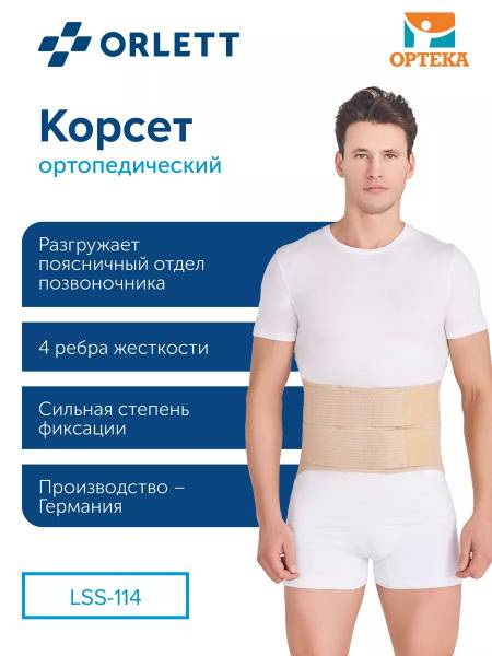 The ORLETT LSS-114 lumbar support brace provides strong fixation of the lumbosacral spine. This semi-rigid corset effectively reduces lumbar spine strain, minimizes muscle load, alleviates pain, and allows for comfortable mobility even during acute phases of back pain. It also helps to reduce the need for pain medication.