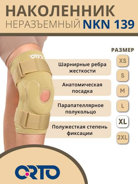 knee brace, knee support, knee orthosis, osteoarthritis brace, rheumatoid arthritis brace, knee injury brace, meniscus tear brace, ligament injury brace, post-surgery knee brace, semi-rigid knee brace, neoprene knee brace, metal hinge knee brace, adjustable knee brace, velcro knee brace, ORTO NKN 139, XL knee brace, beige knee brace, non-removable knee brace, silicone ring knee brace, patellar stabilization.