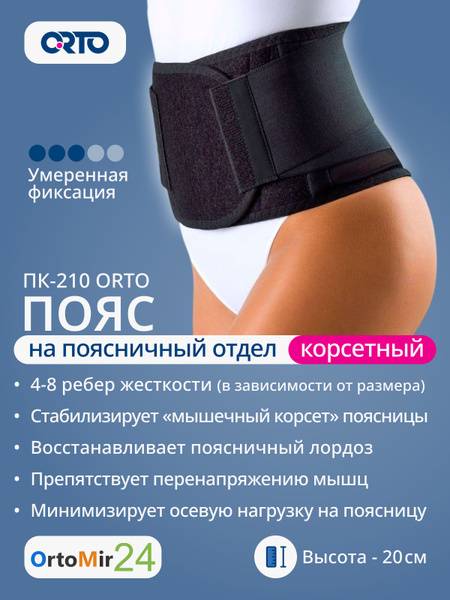 lumbar support corset, back brace, lower back pain, osteochondrosis, spondylosis, osteoporosis, dysplasia, visceral prolapse, ORTO, PK-210, medium support, breathable corset, back support belt, flexible stays, adjustable straps, size L, 20cm height, posture support.