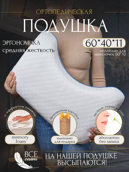 Description: Experience the ultimate sleep comfort and restorative rest with our 60x40 cm orthopedic memory foam pillow. Designed for adults and teens, this hypoallergenic pillow conforms to the natural curves of your head and neck, providing optimal support whether you sleep on your back, side, or stomach. Its unique memory foam construction cradles your head and neck, relieving pressure points and reducing discomfort associated with neck pain and conditions like osteochondrosis. The slow-rebound memory foam gently adapts to your body's contours, offering a supportive yet plush feel that minimizes muscle tension and promotes relaxation. Enjoy a peaceful, odorless sleep, free from the distractions of stiffness and discomfort. This versatile pillow is perfect for those struggling with insomnia or snoring, offering superior comfort for men and women alike. A thoughtful gift for yourself or loved ones, this pillow comes in a compact gift box. We also offer sizes 50x30 and 60x40, including a unique 60x40 model with a shoulder cutout (E-shape). Made in Russia with your health and well-being in mind, wake up feeling refreshed and energized every morning. Experience the anti-stress benefits of superior sleep support every night. #orthopedicpillow #memoryfoam #neckpainrelief #sleepbetter #pillows #60x40pillow #anatomicalpillow #memoryfoampillow #hypoallergenicpillow #gifts #madeinrussia