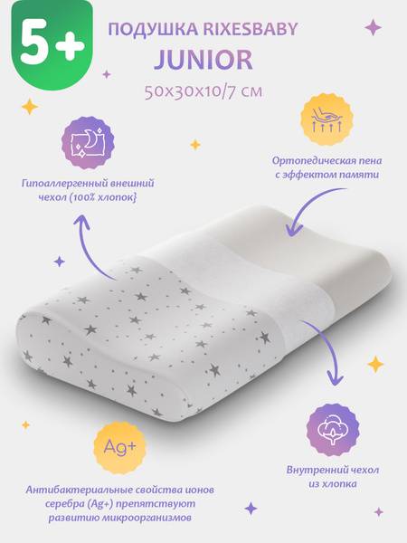 Ensure your child's healthy development and restful sleep with the RixesBaby Junior Orthopedic Pillow. Designed for children aged 5 and up, this 30x50cm pillow provides optimal head and neck support, promoting proper spinal alignment and a comfortable sleeping posture. Its ergonomic design conforms to your child's head shape, distributing pressure evenly to eliminate discomfort. Made with hypoallergenic, skin-friendly materials, this soft and gentle pillow is perfect for sensitive skin. The removable and washable cover ensures easy maintenance and hygiene. Help your child fall asleep faster and sleep soundly through the night with the RixesBaby Junior – a comforting and supportive sleep solution for healthy growth and improved well-being. The 10cm height offers ideal support for growing children.