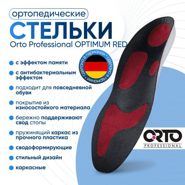 Description: Experience superior comfort and support with Orto Professional OPTIMUM RED antibacterial orthotic insoles. These insoles feature a silver ion-treated fabric that combats bacteria and odor, while the innovative Memopur® material molds to your foot's unique shape and weight for a personalized fit. HydroEnergy silicone gel inserts, highlighted by color accents, provide targeted cushioning and shock absorption in high-impact areas. OPTIMUM RED insoles effectively prevent flat feet, improve gait, enhance foot biomechanics, and reduce spinal stress. The multi-layered Memogel system offers exceptional comfort and support: