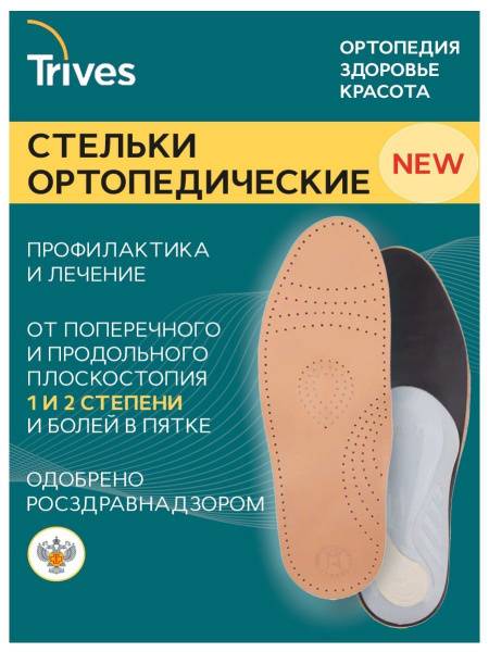 Trives orthopedic insoles feature an anatomical arch support design to alleviate pain and prevent flat feet. These leather insoles are suitable for men and women, offering effective relief from plantar fasciitis, heel pain, and general foot discomfort associated with mild to moderate (1st & 2nd degree) flat feet. Available in beige (ST-104.1) and brown (ST-104.2), they utilize a unique construction to improve cushioning and shock absorption, making walking more comfortable. The drop-shaped heel cushion increases contact area, reducing impact on heels, joints, and spine. Charcoal-infused latex foam neutralizes moisture and odors. Experience superior arch support, muscle and ligament relief, reduced heel pressure, and decreased foot fatigue. Made in St. Petersburg, Russia, using innovative technologies and clinically tested by Roszdrav and our team of orthopedic physicians. Trives: Supporting your health and well-being.