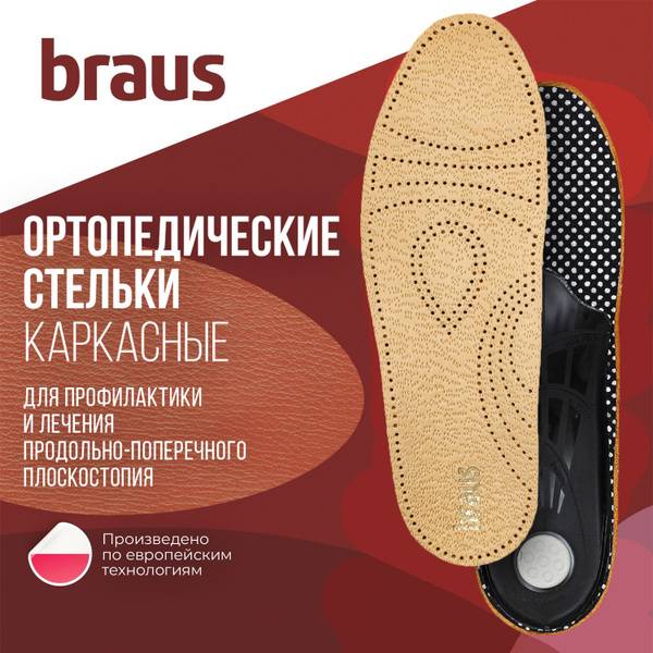Experience superior comfort and support with BRAUS Relax orthotic insoles. Designed in Poland, these full-length, arch support insoles provide effective prevention and treatment of flat feet (both longitudinal and transverse). The contoured design ensures even weight distribution, reducing foot fatigue and pain. The shock-absorbing heel cushion minimizes impact, while the breathable, natural leather upper with perforation keeps your feet cool and dry. Activated carbon effectively neutralizes odor. One size fits most (41-42). Perfect for all seasons and footwear types.