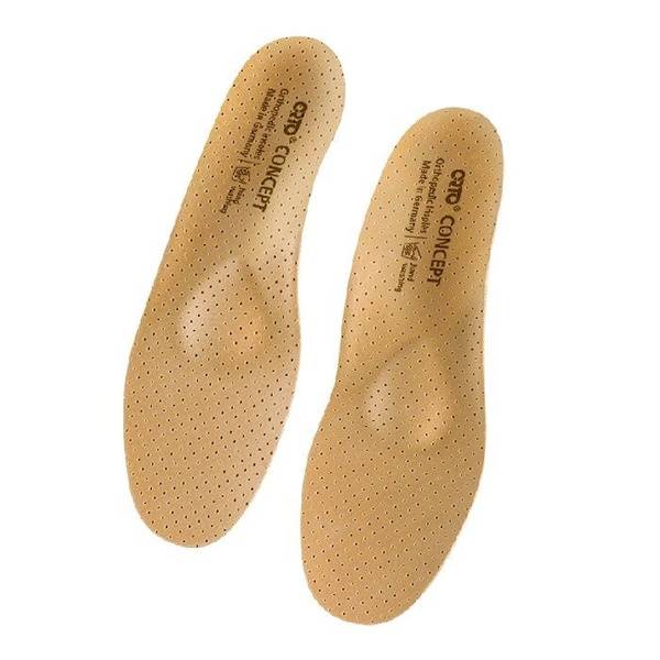 Description: Experience superior comfort and support with ORTO-CONCEPT orthotic insoles, size 40. These insoles feature a semi-rigid plastic frame and are crafted from resilient Carbosan material with breathable perforations for optimal moisture-wicking. A top layer of genuine leather ensures luxurious comfort. The design effectively supports longitudinal arches and the metatarsal arch via a Carbosan metatarsal pad, optimizing gait biomechanics and distributing pressure evenly across the foot. Ideal for individuals with combined flexible flat feet, forefoot splay with hallux valgus, metatarsalgia, and increased ligament laxity. Key features include genuine leather covering, non-woven backing, a pronounced Carbosan metatarsal pad, durable plastic frame, ventilation holes, and a contoured heel cup.