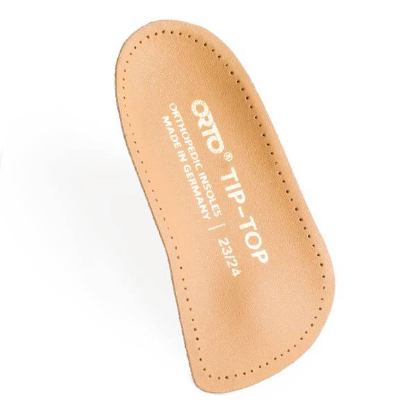 ORTO TIP TOP orthotic insoles provide gentle, supportive care for children's feet. Designed for growing feet, sizes 35, these frameless half insoles feature a natural leather covering for comfort and breathability. Their supportive design addresses several common foot problems: