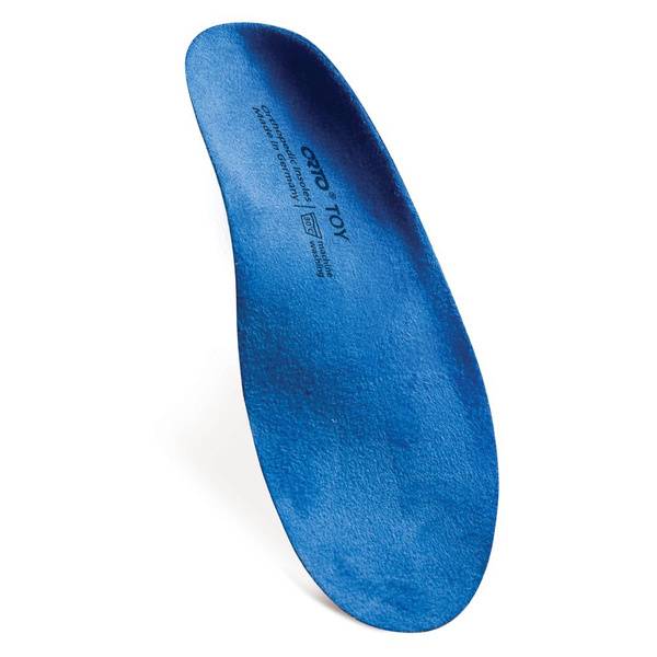 ORTO TOY Size 15 Orthotic Insoles provide comprehensive support for children's developing feet. These insoles feature a unique design incorporating a supportive heel cup that gently elevates the inner edge of the heel, correcting valgus deformities (inward tilting of the heel) up to 10 degrees. The extended metatarsal support and pronounced longitudinal arch support work together to restore the foot's natural anatomical shape, promoting healthy foot development and reducing strain on the entire lower body.
