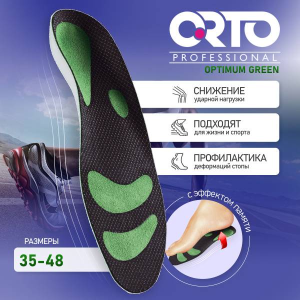 Experience ultimate foot comfort and pain relief with Ortho Professional Optimum Green insoles. Designed for men and women, these supportive insoles feature a durable plastic arch support, cushioning Memopur® memory foam, and antibacterial silver-infused fabric to combat odor and moisture. Targeted HydroEnergy silicone gel inserts (highlighted in green) provide additional shock absorption in key areas, alleviating pressure points and promoting healing. Ideal for various conditions, including plantar fasciitis, flat feet, and general foot pain, these versatile insoles are suitable for all types of footwear – from athletic shoes and dress shoes to sandals. Enjoy superior comfort and support whether you're running, working long hours on your feet, or simply going about your day. Order your pair of Ortho Professional Optimum Green insoles (size 45) today and experience the difference!