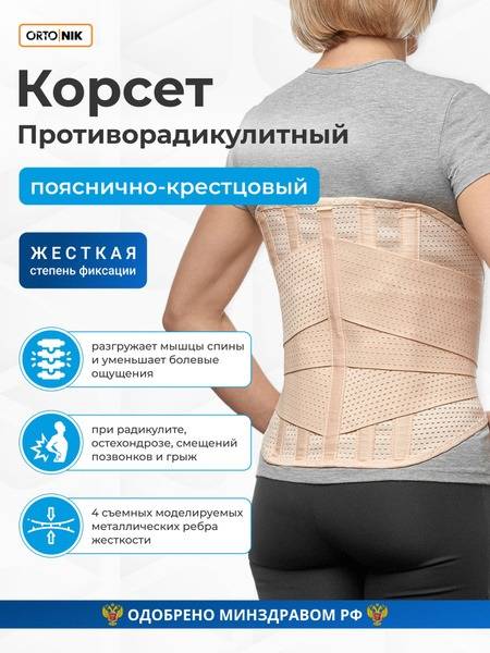 - The adjustable metal stays, combined with the base material, stabilize the "muscular corset" and unload the injured spinal segment by transferring static load from the affected area to the healthy underlying area, resulting in a significant therapeutic effect.
