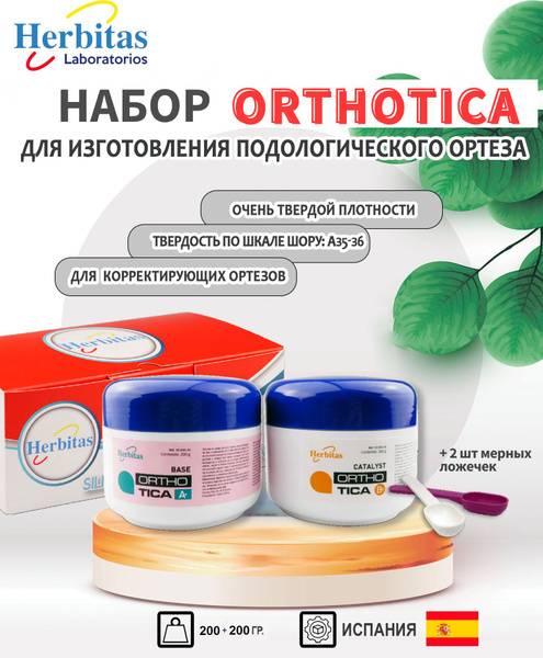 Create professional-grade podiatric orthotics with the Herbitas Orthotica high-density silicone kit. This premium 200g silicone mass and 200g catalyst kit (Shore A hardness 35-36) features innovative ingredients: Hydroxiprolisilane, promoting skin regeneration, and BioMASTER, providing long-lasting antimicrobial action with silver ions. Orthotica silicone is easy to work with, non-sticky, and boasts excellent polishability, elasticity, and a natural skin tone. Ideal for corrective and supportive orthotics, including pediatric applications. For professional use only. Includes two measuring spoons. Made in Spain.