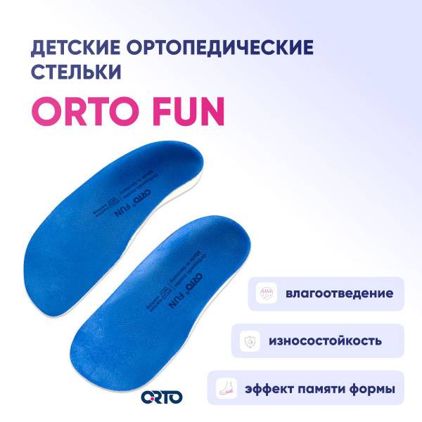 Orto Fun children's orthopaedic insoles offer comprehensive support and correction for developing feet. Featuring a rigid supportive frame with pronounced lateral support extending to the metatarsal heads, these insoles provide excellent arch support and stability. The deep, cup-shaped heel cup cradles the foot, promoting proper alignment. A durable, comfortable top layer ensures long-lasting wear and all-day comfort.