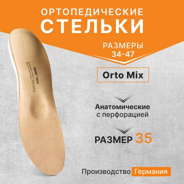 Experience superior comfort and support with Orto-Mix 35 orthopedic insoles. Crafted in Germany, these insoles feature a cushioning Memopur layer that molds to your foot's unique shape, effectively distributing pressure and relieving pain. The design incorporates a shortened frame with a teardrop-shaped heel cup, pronounced longitudinal arch support, a medium-sized metatarsal pad, a cup-shaped heel recess, and lateral support. The durable, wear-resistant top layer ensures long-lasting performance. Orto-Mix 35 insoles are designed to: