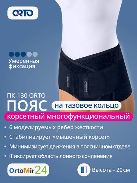ORTO PK-130, corset belt, pelvic support, lumbar support, back brace, lumbosacral support, back pain relief, post-surgical support, pregnancy support, radiculitis, disc herniation, iliac fracture, femoral neck fracture, pelvic ring instability, orthopedic support, traumatology, obstetrics, gynecology, medical brace, XL, black, size chart.