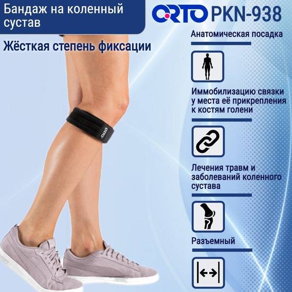knee brace, patellar ligament brace, patellar tendinitis, jumper's knee, Osgood-Schlatter disease, knee pain, knee support, knee stabilization, ORTO PKN 938, knee injury prevention, tibial tuberosity, Velcro closure, adjustable knee brace, comfortable knee brace, universal size knee brace, leg brace