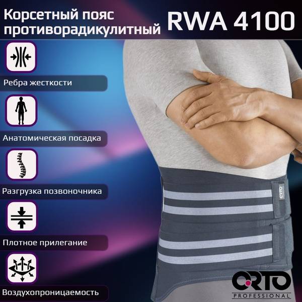 lumbar support brace, back brace, orthopedic corset, lumbosacral corset, back support, spinal support, lower back pain, back pain relief, posture corrector, spondylitis, spondylolisthesis, osteochondrosis, osteoporosis, herniated disc, sciatica, lumbago, post-surgery recovery, injury recovery, adjustable back brace, PRO-fix fastening system, ORTO RWA 4100, medical brace, spinal stabilization.
