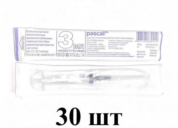 Description: These sterile, single-use, 3ml, three-part Pascal syringes are equipped with a pre-attached, removable 22G (0.7x40mm) needle. The injection needle features a three-facet laser sharpening, polishing, and silicone coating for reduced pain and trauma during injection. Its thin-walled construction ensures smoother administration of liquid medications. The needle color coding conforms to ISO 6009 international standards. The syringe features a Luer-slip connection and a coaxial (concentric) Luer fitting, ensuring precise alignment. The syringe's clear barrel features a permanent, easy-to-read scale for accurate medication measurement up to 3ml. A double-stop ring prevents accidental plunger removal and medication leakage during preparation. Each syringe is individually blister-packed to maintain sterility and integrity, offering convenient, single-use access. Ideal for medical professionals and healthcare settings requiring reliable and precise injection tools.