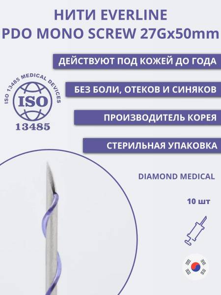 Everline PDO Mono Screw 27x50 mm is a sterile, single-use micro-cannula system for contour plastic surgery. It combines a medical steel needle-probe with a smooth, resorbable polydioxanone (PDO) thread, designed for controlled subcutaneous placement.