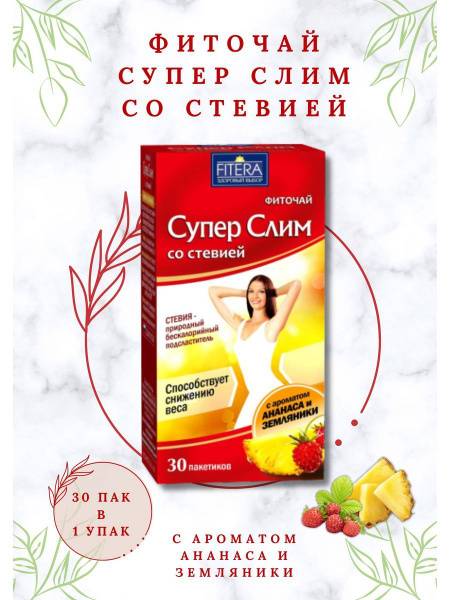 Fitera Super Slim is a dietary supplement in filter-bag form formulated to support weight management, body cleansing, and digestive wellness. Each bag contains a balanced blend of herbs and delivers pineapple and strawberry flavor with stevia as a non-caloric sweetening note.