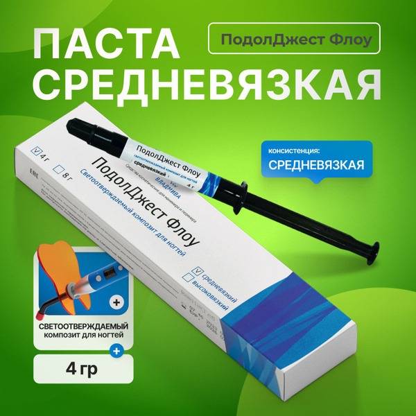 VladMiVa Podoljgest-Flow paste is a light-curing composite designed for professional nail and foot care services. This medium-viscosity formulation is used to secure titanium wire and other corrective systems in orthodontics and nail reconstruction.
