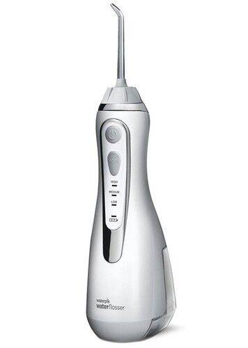 The Waterpik WP-560 E2 Cordless Advanced portable irrigator is your perfect travel companion. Its compact size, rechargeable battery, and complete water resistance make it ideal for travel and shower use. The magnetic charger fully charges in under 4 hours, and the universal 100-240V voltage allows charging worldwide. This irrigator features 3 pressure settings (310-520 kPa) for customized comfort, four nozzles, and an easily refillable 180ml reservoir (providing a full 45-second irrigation). A convenient travel case for nozzles and a soft carrying pouch are included. A leak-proof cap prevents spills during transport. Essential for users of braces, implants, crowns, bridges, and veneers, its gentle stream massages gums, stimulating blood flow for healthy gums. Clinically proven to improve gum health around implants (using the Plaque Seeker nozzle) and remove up to 3 times more plaque than floss when using the orthodontic nozzle. Effectively cleans food particles between teeth and gums, reaching areas inaccessible to floss and toothpicks.