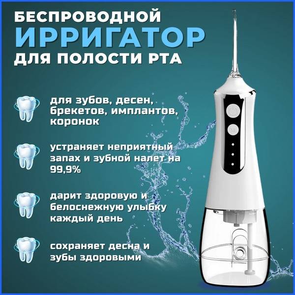 portable water flosser, water flosser, oral irrigator, dental irrigator, rechargeable water flosser, 3 modes water flosser, 5 nozzles water flosser, compact water flosser, oral hygiene, teeth cleaning, gum health, nasal irrigation, braces cleaning, dentures cleaning, periodontal care, orthodontic care, family oral care, gift idea, Spektr-M, Type-C charging.