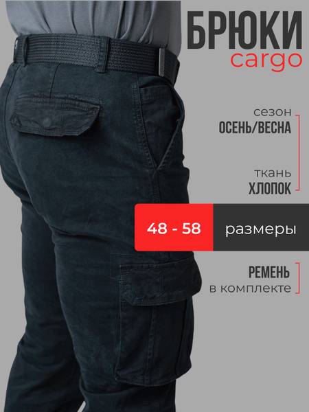 - One pair of men's cargo pants with included belt; available in extended sizing for heights 160–190 cm.