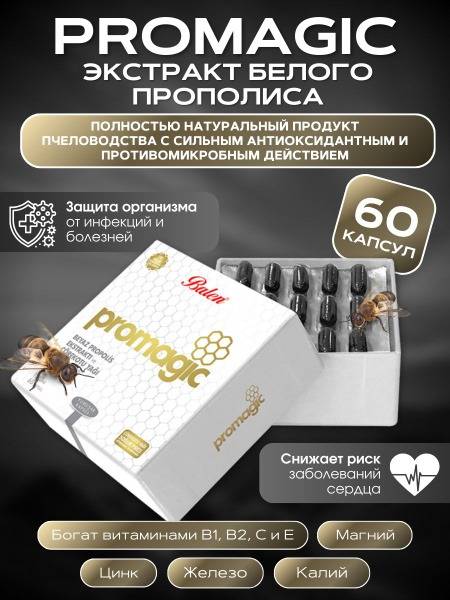 Balen Promagic offers a unique blend of white propolis extract and black seed oil, encapsulated for convenient daily use. This powerful dietary supplement harnesses the natural benefits of two highly regarded ingredients for immune support and overall well-being.