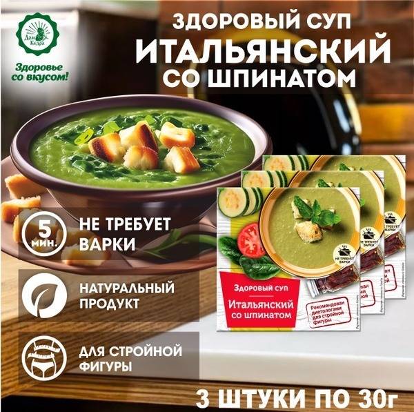 Recommended by nutritionists for weight management. Our Italian Spinach Soup is packed with natural antioxidants and is perfect for supporting liver, digestive, heart, and vascular health. Each serving provides a balanced blend of proteins, fats, carbohydrates, fiber, vitamins, and minerals. Spinach, a powerhouse ingredient, helps slow tumor growth and is beneficial for hypertension, diabetes, and bowel health. Its high iron content prevents anemia, while potassium supports heart health and prevents arrhythmia. Other ingredients like zucchini, cornmeal, onion, and sesame seeds improve liver function and bile secretion. Tomatoes and black pepper stimulate digestive juices, normalize digestion, and prevent fermentation and putrefaction in the gut. Benefits include: weight management, blood pressure regulation, improved liver function, support for diabetes management, enhanced digestive and cardiovascular health, anemia prevention, and gentle bowel cleansing.